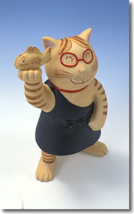 瀬戸の優れた製陶技術を駆使して、さまざまなジャンルで活躍中のアーティストにオリジナル招き猫を創作してもらう「セラミックアート招き猫展」。2003年は、気合いで作る美味しい家庭料理の達人、料理研究家・小林カツ代さんにお願いしました。 「料理研究家と招き猫?」と不思議に思われるかも知れませんね。実は、小林さんは大の動物好きで「愛しのチー公へ」という愛猫や動物たちにまつわるエッセイ集も出されています。食べることを中心に、日々の生活を大切にされている小林さんならではの楽しい招き猫ができるのではないかと考えたのです。 小林さんがデザインしてくださったのは、ご本人がモデルらしく、眼鏡をかけてワンショルダーのエプロンを着用、手には大きなタイヤキを掲げているというユーモラスな作品です。「手に何を持たせるか、フライパンと迷ったんだけどタイヤキにしました」 縁起物の鯛がタイヤキになるあたり、小林さんの気取らないお人柄が伝わってきます。「食べる幸せ」「健康」「元気」・・・・いろんな福を招いてくれそうな、ハッピーな招き猫が誕生しました。 |