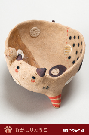 愛知県長久手町のご自宅兼工房に取材に伺った時、「陶に織りのような色を入れられないかな…」というアイデアを話されていたひがしさん。染織を学ばれた経験を活かし、新たな手法で制作された創作招き猫を出展します。やさしい色合いで装った今年の“つちねこ”に会いに来てください。 |