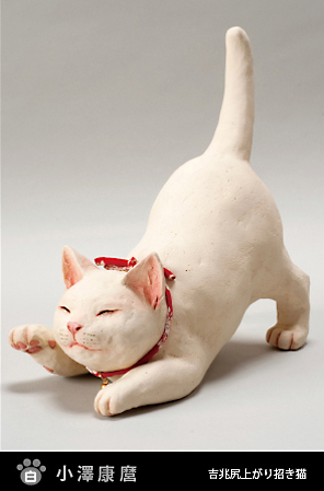 | 漆を使ったり、オルゴールの機械をアレンジして動く作品を考案したり、未知の手法に取り組むチャレンジャー。小澤さんの作品にはいつも新しい何かがあります。取材で瀬戸市のアトリエに伺った時も、「猫の目」の表現を追求するために様々な素材を研究中でした。手を動かし創っていく過程でアイデアは自然にかたちになってくるのだそうです。「より伝える」ための研究には力を惜しまず、人のできないことをやる――小澤さんの創作招き猫は今年も新風を巻き起こします。 |