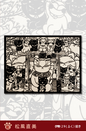 刃物で描く潔い線や背景に重なる紙の色合いなど、切り絵独特の表現を活かし、曼荼羅図を題材にした大作から、さりげないことばを添えたひとひらの小品まで、幅広い作品を制作されている松風直美さん。今回出展される新作、『伊勢29(ふく)招き』は、29匹の招き猫がお参りする人々を出迎えて、思い思いに福を招くという楽しい作品です。さてさて、29匹全員を見つけることができるでしょうか?