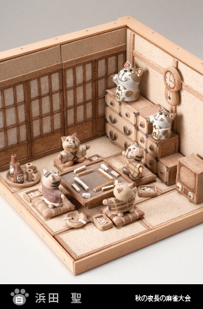 たくさん並んだユーモラス小さな陶の招き猫たち、そのひとつひとつに「くすっ」と笑えるユーモアが込められているのですが、圧巻はその小さな猫たちが活躍する陶のジオラマです。建物や家具、小物の細部にまで、見た人を楽しくさせるアイデアがぎっしり!