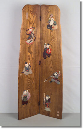 天然木(栗)の屏風に押絵(江戸ちりめん・虎目石・紫水晶・緑瑪瑙)七福神に化けた 招き猫たち