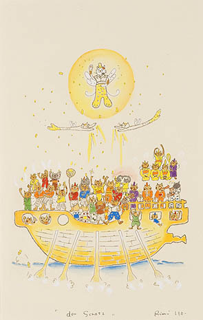 その年の春、三毛猫のお披露目の日、猫達が船の上で楽しくお祝いをしている様子です。 |