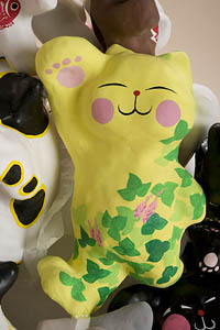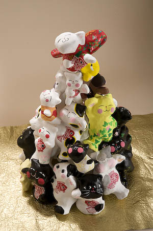 この小唄からイメージをふくらませ“備中生まれの白猫のたまさん”が満月の夜、仲間達と楽しく踊る招き猫にしました。