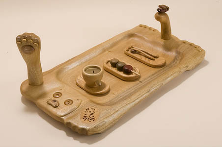 背中には、小判型ソーサーと茶柱の立った猫カップ、小判皿と三色団子、猫の手小判型ナイフ・フォーク置きの、ままごと三点セット。 |