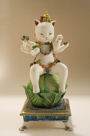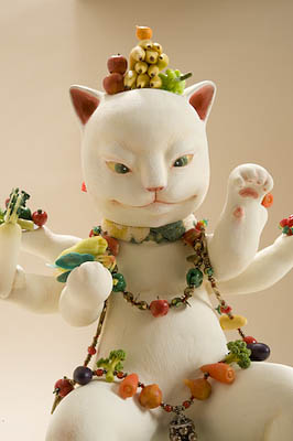 もともと猫好きで猫をモチーフにした物に常に興味を持っていたのですが、その中でも招き猫の不思議な魅力に取り付かれ独学で造り始めて数年です。今も変わらず楽しんで造っています。可愛らしく、見ていると和むのだけれども、根本は謎めいていて神秘的な媚びない眼差しを向けてくる。私の持つそんな猫のイメージを立体作品で表現してみたいという思いで作品造りに取り組んでいます。