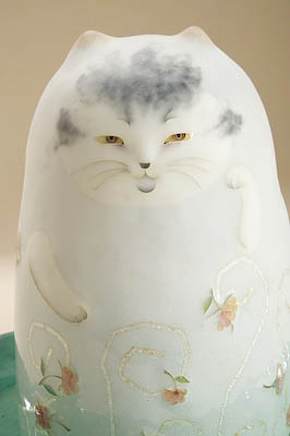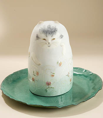 現在は猫のヒメと同居中。いつのまにか増えてしまっている猫のモチーフの七宝作品は絵皿、アクセサリー、立体の立ち招き猫、額絵の数々とどんどん広がっていく。最初は家の猫をモチーフにした小さな皿1つだけだったのに・・・これも招き猫様の力か作品を喜んでくださる方々のおかげであろうか。これからも、どこにもない猫たちを生み出していきたい。