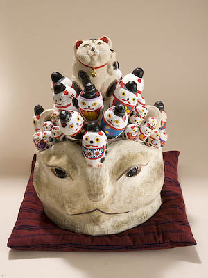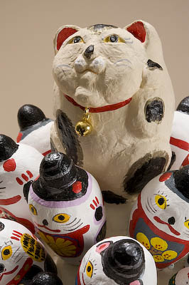 骨董の招き猫や、日本の古い着物生地などが好きで縁日や骨董市などを歩いて蒐集するうちに、猫をモチーフにした創作を始めるようになりました。