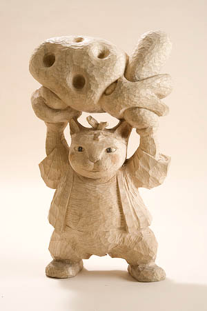 現在は、農業の神様である水神や太陽神を木彫りで表現した「おてんとう様と地球のかぞく」シリーズも発表。
