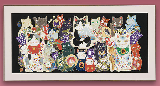 長い年月をともに暮らした我が家の猫達は、お金や宝物といったものは運んでくれませんでしたが、彼らに囲まれた日々が安らぎやぬくもりのあるかけがいのない時間だったことを、今懐かしく振り返っています。染額におさまった猫が、見る人の心に小さな幸せを届けてくれたらという思いで、これからも制作を続けて行くつもりです。