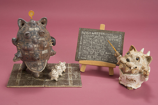 現在『ヘンテコオートバイ人形』シリーズ、『鬼』シリーズ『ねこ』シリーズ『機械との対話』シリーズでいつも作る大きさはテレビの上に置けるぐらいです。今後は、『ねことねずみの大戦争』、『どうみても飛ぶための機械なのにどうみても飛びそうにもない飛行機械たち』あとは、宮崎駿を見て育ってあの世界の、機械の世界がとても大好きで本当に夢だけど、ナウシカ、ラピュタ、コナン etc に出てくる機械たちをジブリの空気が感じられるような立体作品を作ってジブリ美術館で個展をやりたいです。これは、食べるための仕事(器づくり)を減らしてでも、どうしてもやりたい、必ずやりたい、宮崎駿さんが生きてるうちに!