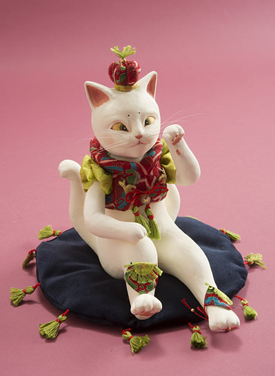 もともと猫好きで猫をモチーフにした物に常に興味を持っていたのですが、その中でも招き猫の不思議な魅力に取り付かれ独学で造り始めて数年です。今も変わらず楽しんで造っています。可愛らしく、見ていると和むのだけれども、根本は謎めいていて神秘的な媚びない眼差しを向けてくる。私の持つそんな猫のイメージを立体作品で表現してみたいという思いで作品造りに取り組んでいます。