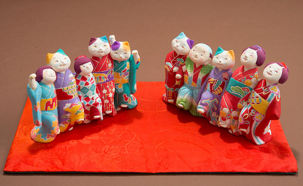 石粉粘土と古布をつかい、木目込み人形風の江戸風俗猫を主に作る。