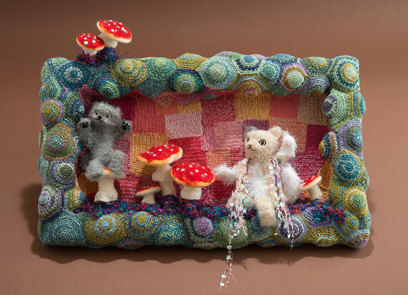 きのこと猫を永遠のテーマに、主に羊毛とニット、刺繍を使って表現しています。