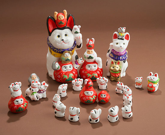 郷土玩具の代表格である招き猫や達磨も、大小たくさんあります。