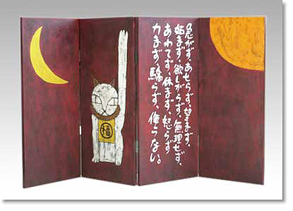 1990年頃より猫の絵を描きはじめ、キャンバス、ベニヤ、陶、布、などに様々な画材を使って制作。『鉄男』ブランドの洋服・雑貨へのハンドペイントのほかギャラリーでの個展による作家活動もあわせて行っている。 |
