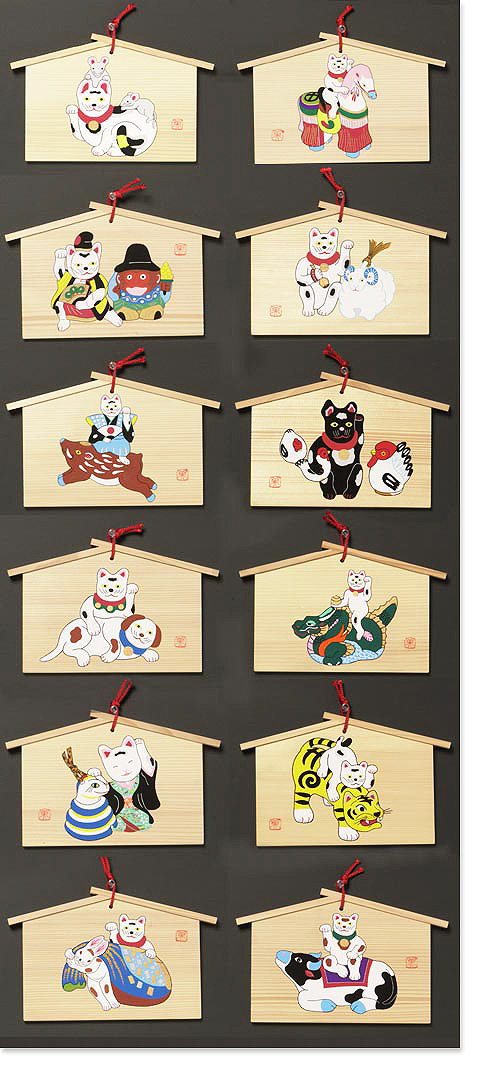 いを込めて十二支と招き猫を組み合わせ絵馬に描いてみました。