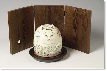 現在は2匹の猫と同居中。いつのまにか増えてしまっている猫のモチーフの七宝作品は絵皿、アクセサリー、立体の立ち招き猫、香立て額絵の数々とどんどん広がっていく。最初は家の猫をモチーフにした小さな皿1つだけだったのに・・・これも招き猫様の力か作品を喜んでくださる方々のおかげであろうか。これからも、どこにもない猫たちを生み出していきたい。 |