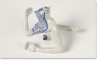 近未来のまねきねこは、どんな感じになっているんだろうと思い作りました。近未来になっても染付の技法は受けつがれています。