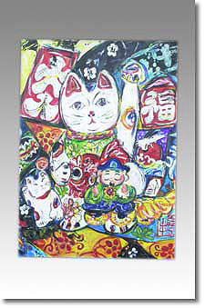 作品は、ビールの空き缶やカラフルなパッケージなどをテーマに多く描いてきましたが数年前より七福神やまねきねこなど日本の文化的なものも描く様になりました。将来はインテリア関係、ファッション関係の雑誌のイラストや、タバコやスニーカーなどの広告ポスターに作品を使われたいと思います。(夢です) |