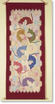 “六角つなぎ”した土台布に彩々の招き猫をあしらいました。