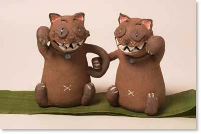 長い間、器の制作をしていましたが、2年間、施設で障害者の方々と粘土遊びをするうちに、人形として、土に表情をもたせていくことに興味を持つようになりました。見る人を楽しませたり、おどろかせたりする人形たちの魅力に、今ではすっかりとりつかれています。現在は、魔法使い・ウサギ・ブタ等をつくっています。長く親しんできた゛陶土″の味を生かし、゛陶土″でつくることに意味のあるような作品をつくっていきたいと思います。 |