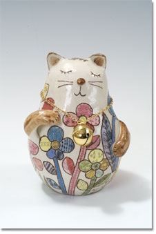 手びねりで作られたねこには、彩とりどりの花が見ているだけでハッピーに。我が家のきまぐれねこ“ニャー”がモデルです。