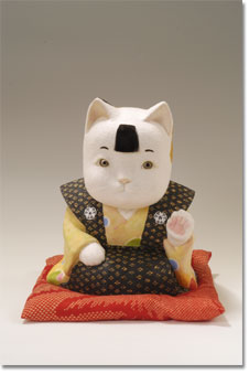 絵の具のかわりに色和紙をはり踊るトラやぶちの猫をつくっていたが、最近は古布もつかう。和紙で古布に負けない存在感をもつ人形をつくるのが夢。