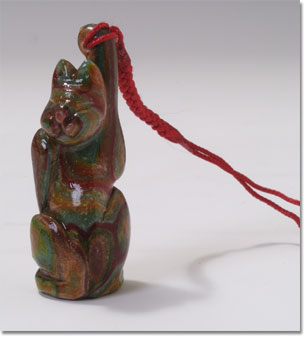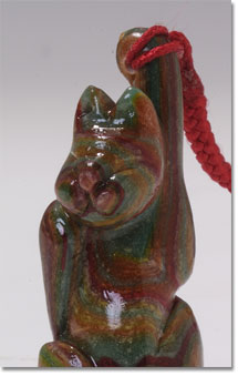 根付として使用が可能な彫刻招き猫。素材は張子人形制作者というだけあってもちろん和紙。和紙を張り合わせ彫刻をほどこし、貴石のようにみがきあげました。強度は木材並ですが、和紙なので、ストラップとして使用すれば丈夫な上、携帯電話もキズつけません。ただの招き猫の形ではつまらないのでちょっと上体をひねらせて、ふりむいた姿にしたところに面白味を感じて下さい。素材的にも技術的にもこれ一品のみしか制作しないので、非売品。