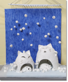 大きな「かまくら」の招き猫を中心に、大小のかわいい「雪玉」招き猫たちが楽しそうに空からふってきます。 |