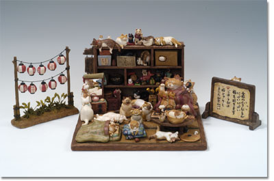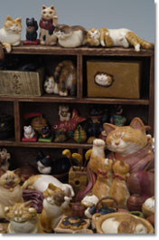 私が子供の頃は、工作になる材料が少ない時代でしたので、捨ててしまうような物を大事に取って置き、思いつくまま創造の世界に没頭していました。どんな事でもとことん納得するまでやり遂げないと気が済まない凝り性で、人から見たら無駄な物ばかりだったかもしれません。でもそれが今では作品作りのアイデアとなり継続出来る原動力になっていると思います。唯一物作りの根底が覆されたのは猫作りでした。「なぜ猫にならないのか?」毎日粘土と格闘して、何百個作ってもその中で満足出来るのはほんのわずか、まだ着色していない猫の方が多いかもしれません。これからの作品の傾向として、顔や手が動くからくり猫や母となり子供と共に経験した思い出を織り交ぜながら、人間に一番近い猫にその思いを込め制作して行こうと思います。「猫ってこんな仕草もするよね」と思わずうなずいてしまう様な、楽しく心が癒される作品になれば良いですね。 |