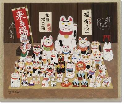 京都・伏見人形の「子福猫」のユーモラスな造形と表情に惹かれて、招き猫を描き始めて15年。