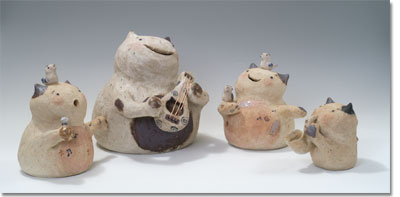 やわらかな土だったり、ゴワゴワ、ツブツブの土だったり、多種の土をブレンドしてみたり、土まかせにほそ長いのやまるまるのネコをつくります。色土をぬったり、いぶしたり、まだまだ技法もいろいろためしながら、、、。あったかみのあるほのぼののツチネコをつくってゆきたい。
