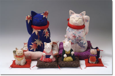 現在好評を得ております「ちりめん招き猫」に加えて新機軸として「ちりめん着物猫」シリーズを展開中。徐々に取り扱い店を増やしつつ、プロとして郷土玩具作家との両立を目指しております。