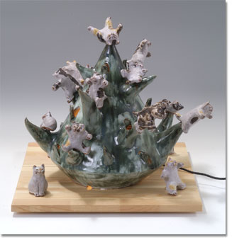 多治見工業高校専攻科を卒業後、グループ展ではじめて猫ものを発表して以来、すっかり猫ものにはまってしまっている。実際2匹のトラと白猫を飼っていて、日々しぐさや行動を楽しんでいる。猫グッズは箸置き、器、置物、などいろいろ作っている。でも、猫ばかりではなく練り込みの作品も好きで作っている。 |