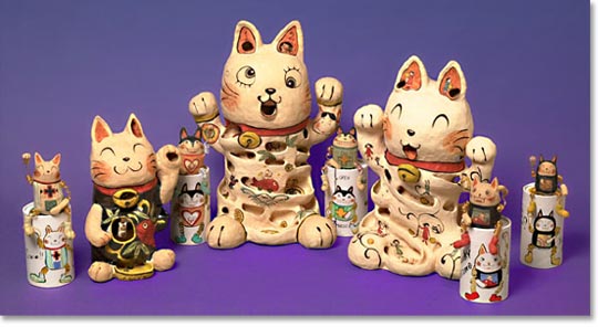 | 「2002年度日本招き猫大賞」は、造形作家・渡辺志野さん(愛知県瀬戸市)が出品された「子供心遊び猫具(にゃんぐ)」に決定しました。 昔懐かしい「コリントゲーム」のように、焼き物の招き猫のあちこちにホールやポケットが設けられ、素焼きの小さな陶玉をころころと転がして遊べる作品。老若男女を問わず、思わずやってみたくなるような魅力に満ちています。まさに、遊び心が福を呼ぶ招き猫です。高さ50センチの大作をこのようなかたちに造型・焼成した技術力も高く評価されました。 2003年9月27・28日、新世紀工芸館にて大賞受賞個展実施。 |