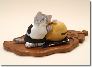ねこ寺では、立派な招き猫になるための修行があります。こぞうねこのボクはお尚ねこのお経をききながら木魚をたたいたり、朝のおつとめ(そうじ)をしたりと毎日がんばっています。でも、ついつい……だってねこですもん。 |