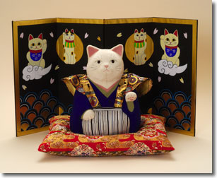 背景に自作の絵屏風を用意。こちらも招き猫の図柄です。 |