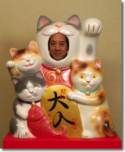 瀬戸市では2005年にEXPOもひかえているという事で、たくさんのお客様や福を呼んでくれるように、自らが招き猫になって福を招く、究極の招き猫を考えてみました!