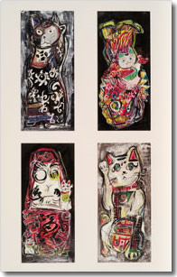 作品は、ビールの空き缶やカラフルなパッケージなどをテーマに多く描いてきましたが、数年前より七福神やまねきねこなど日本の文化的なものも描く様になりました。