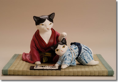 | 母子猫シリーズ第7段。習字の練習をしている子猫と、それを見守る母猫。今年も親子で福を招きます。 |