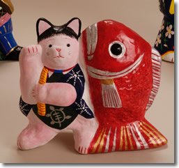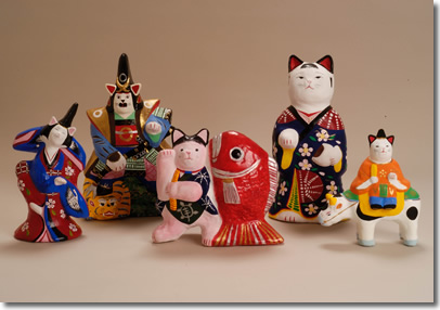 | 昔なつかしい郷土人形の姿を借りた五人の招き猫たちです。 |