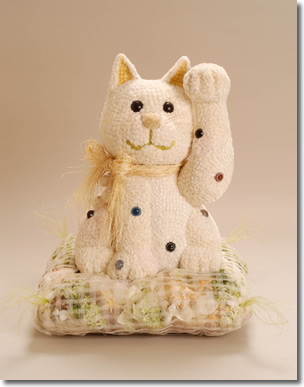 | 「ウエルカムフラワー」(お客様を招き入れる歓迎の花)と「招き猫」をかけ合わせ、瀬戸弁のいらっしゃいである「いりゃあ」というタイトルにしました。ドライフラワーやプリザーブドフラワーでトピアリーを作り、夏らしい涼しげなイメージにしました。 |