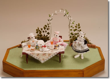 素材:木台、石粉粘土、布レース、ミニチュア陶器 |