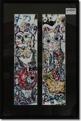 作品は、ビールの空き缶やカラフルなパッケージなどをテーマに多く描いてきましたが数年前より七福神やまねきねこなど日本の文化的なものも描く様になりました。将来はインテリア関係、ファッション関係の雑誌のイラストや、タバコやスニーカーなどの広告ポスターに作品を使われたいと思います。(夢です)