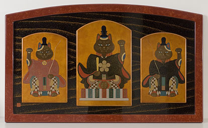 漆の業界は各仕事が分業で、職人はその部分の仕事しか出来ないが私は木工、素地から下塗り、上塗り、加飾と全部自分で出来るので、自由な作品作りが可能です。今まではデパート等の注文仕事でしたので題材や器物は決ったものでしたが、平成16年より独立して自由に出来るようになりました。そこで前々から目指していた招き猫の世界へ漆で仲間入りさせていただくつもりです。今回は平面に近い形での参加ですが、いずれは乾漆という奈良時代あたりから造られている仏像の技法を使って、立体の招き猫を造り出したいと思っています。今年10月13日〜18日の東京神楽坂アユミギャラリーでの個展でも出品作の半分は招き猫でいくつもりです。木工も自由に出来ますので、色々夢は広がっています。