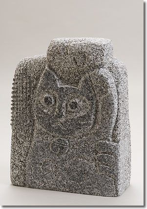 石の持つ温かさに魅かれて、石彫刻を始める。玄関先の沓脱ぎ石、家の周りなどを囲っていた縁石、辻に立っていた道しるべ、漬物石に石臼と、かつては身近だった石が、ずいぶん身の周りから消えつつある現在、石を生活の中にもう一度取り戻したいと、滋賀県大津市山中のアトリエで創作活動を続けています。最近は墨絵など、絵画も手掛けています。今井さんの作品は、いつか見た道端の道祖神やお地蔵さまのような、遠い日の記憶をよびさまします。 |