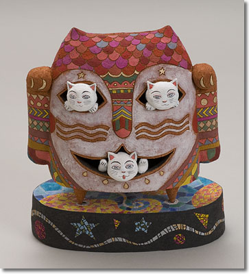 紙(張り子)、古布、粘土などの素材をつかって、郷土玩具のようなホノボノとしたモノから、幻想的なタイプのモノ、オブジェ的なモノまで、いろいろ作っています。これからも様々な手法を試みながら、私なりのネバーランドの住人達をつくりつづけていきたいと思っています。