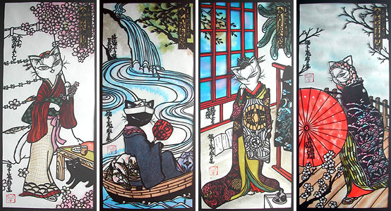 ある時その国の高名な浮世切絵師、猫手山風麻呂が描いた「美猫招四季撰」が大流行。四葉の浮世切絵は飛ぶように売れたのだそうな。