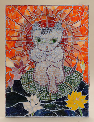 招き猫ならぬ「お願い猫」として蓮の葉の上に乗り、お願いの又は祈りのポーズをとる猫。そのからだからは、かがやいて出る光り、後光の威力を持つ猫像 それは、『菩薩猫、釈瑠六度』皆様の願いが、夢が叶いますように。
